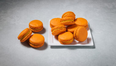 קולקציית המקרונים באריזה חדשה! עוגיית מרנג שקדים, עם גנאש מנגו אלרגנים: בכפוף לתווית על גבי המוצר