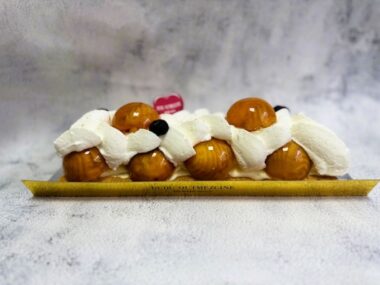 עוגה חגיגית עם תחתית בצק עלים חמאה,קרם פטיסייר, פחזניות מקורמלות במילוי קרם פטיסייר וקצפת וניל.