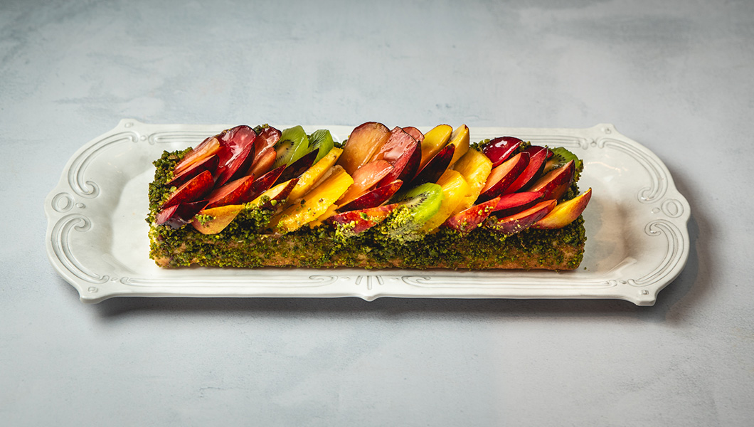 בצק פריך חמאה אפוי עם קרם שקדים, קרם פטיסייר ופירות טריים עונתיים עם פיסטוק במסגרת הפירות משתנים לפי העונה