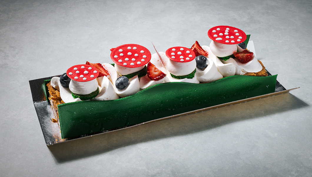 קרם יוזו הדרים, קרמו פטל בשכבות ג'אקונד פיסטוק, מוס מסקרפונה בציפוי גנאש פיסטוק.