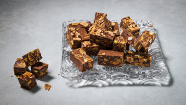 אורז תפוח, פקאן קלוי, דבש, חמאה, חלבה, קקאו בזיגוג שוקולד לבן