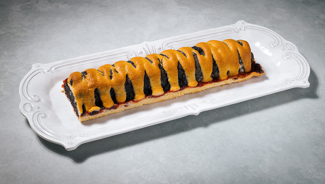 עוגת פרג(מבושל עם חלב) עטופה בבצק פריך עם נגיעה של ריבת תות