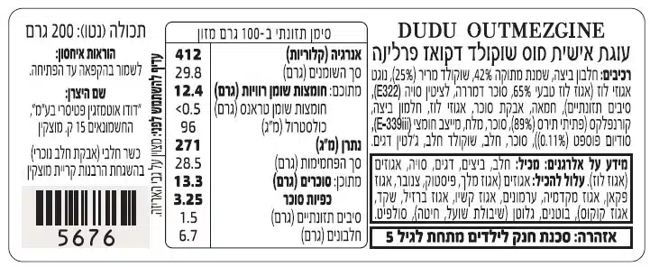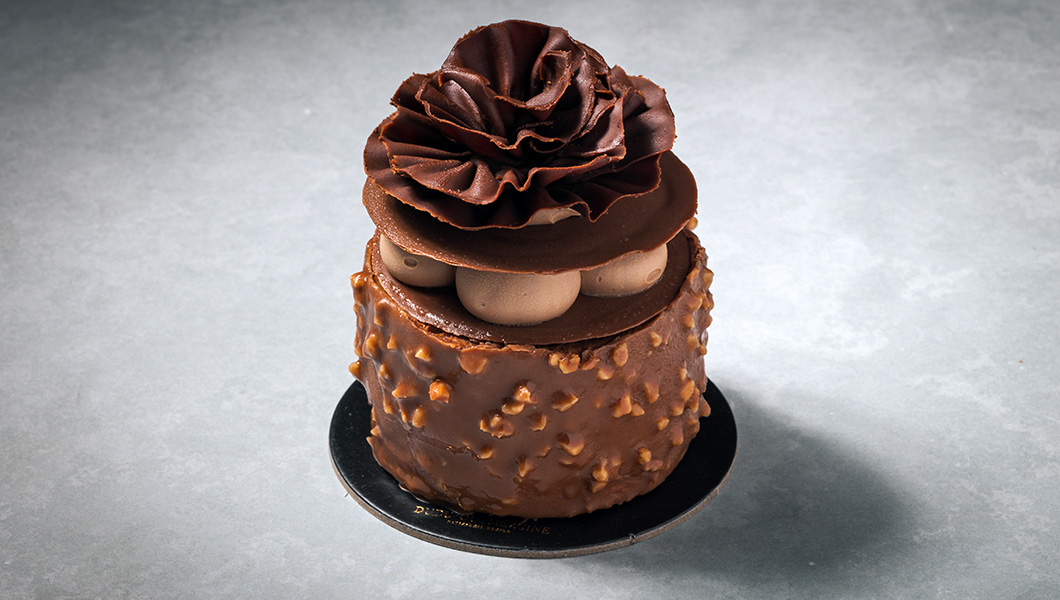 מוס שוקולד מריר, פרלינה פייטה בין שכבות שוקולד חלב, על בסיס דקואז אגוזי לוז.