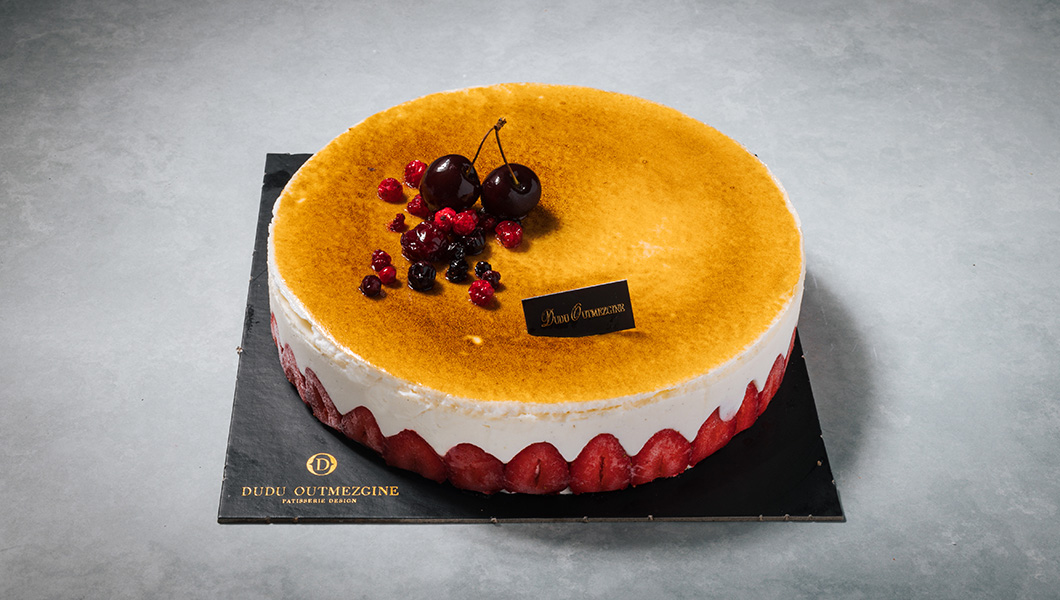 קרם פטיסייר עם שמנת מתוקה בין שכבות דקואז (מרנג שקדים וקוקוס) עם מחית תות. תותים טריים ומרנג איטלקי