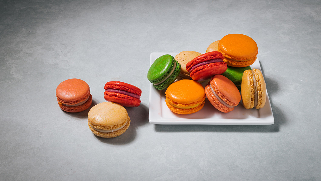 עוגיית מרנג שקדים, במילוי גנאש במגוון טעמים. ( תות, פירות יער, מנגו, לימון, שוקולד , וניל וקפה)