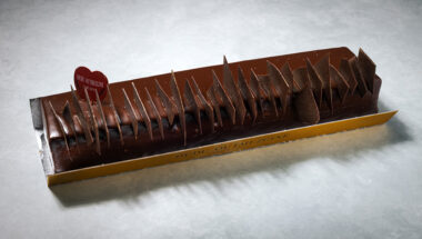מוס שוקולד חלב ולבן עם קרנץ' נוגט,על בסיס דקואז אגוזים.