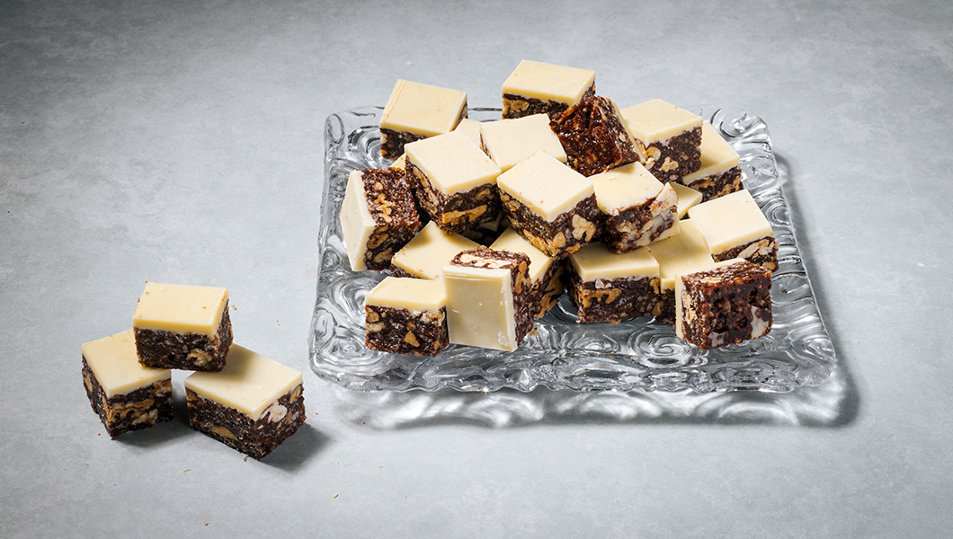 אורז תפוח, פקאן קלוי, דבש, חמאה, חלבה, קקאו בזיגוג שוקולד לבן