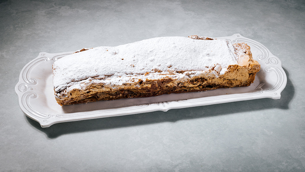 שכבות בצק שמרים אפוי עם מרנג בטעם קפה ואגוזי מלך טחונים