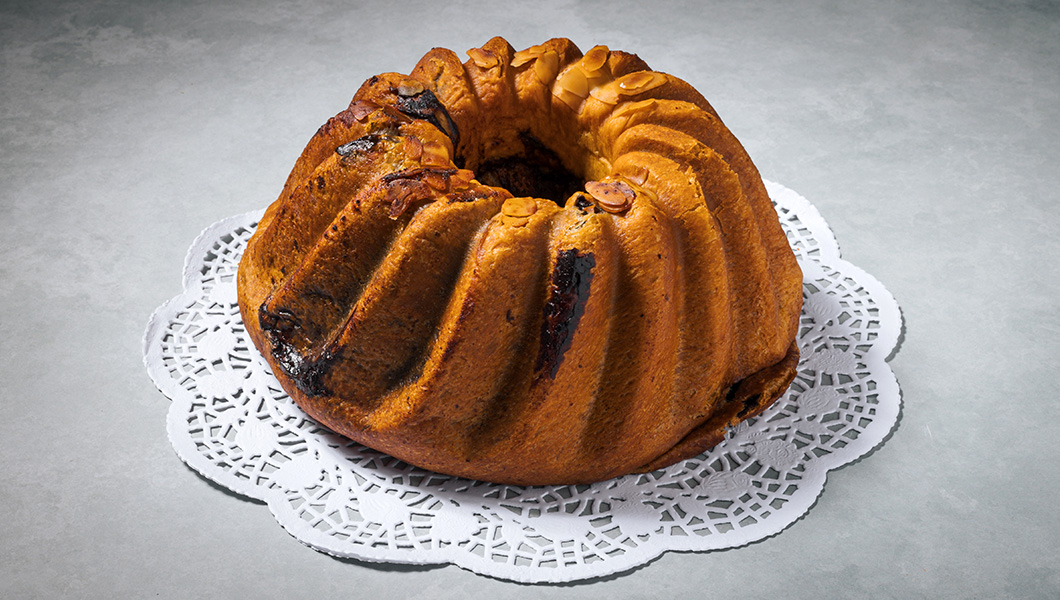 בצק בריוש רך, במילוי קרם שקדים ובציפוי שקדים פרוסים.