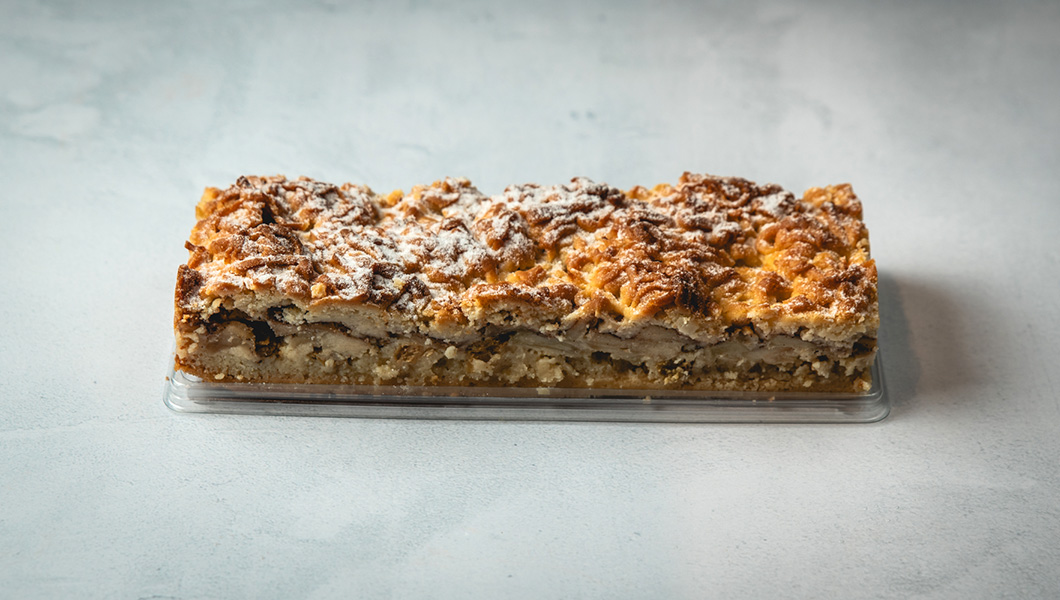 בסיס פריך, פיננסיר שקדים, תפוחי עץ מבושלים בחמאה וצימוקים עם קינמון וקרמבל מעל