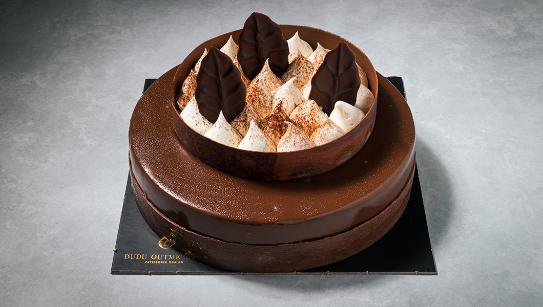 מוס שוקולד מריר, פרלינה פייטה בין שכבות שוקולד חלב, על בסיס דקואז אגוזי לוז.