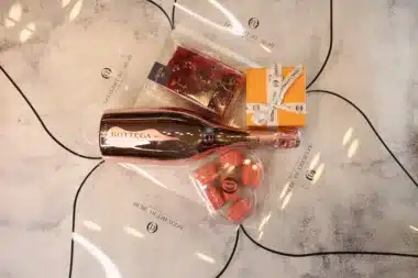 מארז יוקרתי המכיל שמפנייה פרוסקו בוטגה גולד, מארז מקרונים מיוחד בטעם תות, עוגת גבינה פירות יער ומארז 4 פרלינים בעבודת יד.