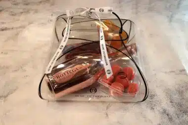 מארז יוקרתי המכיל שמפנייה פרוסקו בוטגה גולד, מארז מקרונים מיוחד בטעם תות, עוגת גבינה פירות יער ומארז 4 פרלינים בעבודת יד.